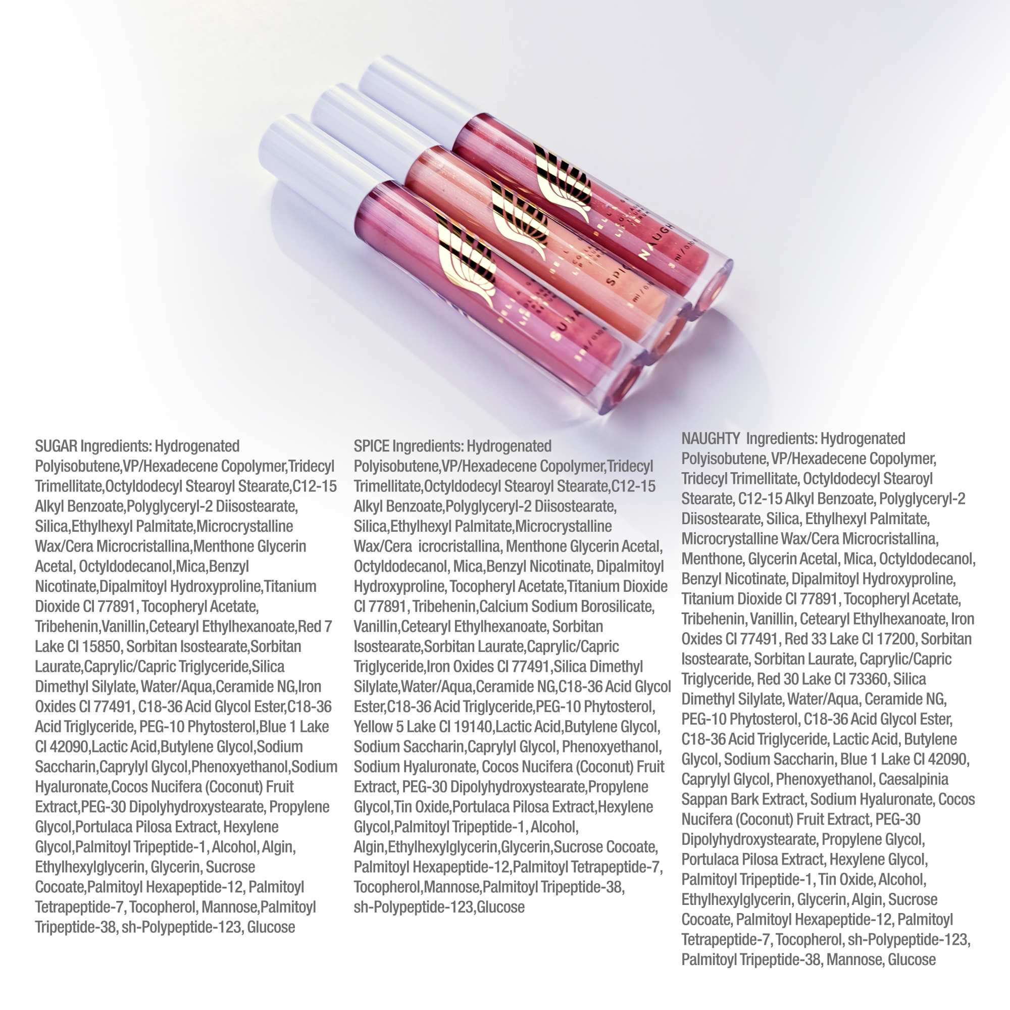 향신료 성분:하이드로제네이티드폴리이소부텐,브이피/헥사데센코폴리머,트리데실트리멜리테이트,옥틸도데실스테아레이트,C12-15알킬벤조에이트,폴리글리세릴-2다이이소스테아레이트,실리카,에틸헥실팔미테이트,마이크로크리스탈린 왁스/세로크리스탈리나,멘톤글리세린아세탈,옥틸도데카놀,운모,벤질니코티네이트, 다이팔미토일하이드록시프롤린, 토코페릴아세테이트, 티타늄디옥사이드 CI 77891, 트리베헤닌, 칼슘보로실리케이트, 바닐린, 세테아릴에틸헥사노에이트, 솔비탄이소스테아레이트, 솔비탄라우레이트, 카프릴릭/카프릭트리글리세라이드, 철 산화물 CI 77491, 실리카디메칠실릴레이트,정제수/아쿠아,세라마이드엔지,C18-36산글라이콜에스터,C18-36산트리글리세라이드,피이지-10 피토스테롤, 황색 5호 CI 19140,젖산,부틸렌글라이콜,소듐사카린,카프릴릴글라이콜,페녹시에탄올,소듐하이알루로네이트,코코넛(Cocos Nucifera)열매추출물,피이지-30다이폴리하이드록시스테아레이트,프로필렌글라이콜,틴옥사이드,마치현추출물,헥실렌글라이콜,팔미토일트리펩타이드-1,알코올,알긴,에틸헥실글리세린,글리세린,소크로스코코에이트,팔미토일헥사펩타이드-12,팔미토일테트라펩타이드-7,토코페롤,마노스,팔미토일트리펩타이드-38,sh-Polypeptide-123,글루코스